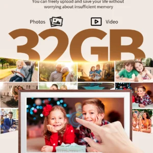 32GB storage & Instant Wireless Sharing :Built-in 32GB memory can achieve powerful storage function (about 80,000+ photos), and you can also use Micro SD (up to 64GB) card to import pictures in batches. Smart electronic photo frame can liven up your precious memories anywhere and anytime as fast as they want by allowing you to share.
